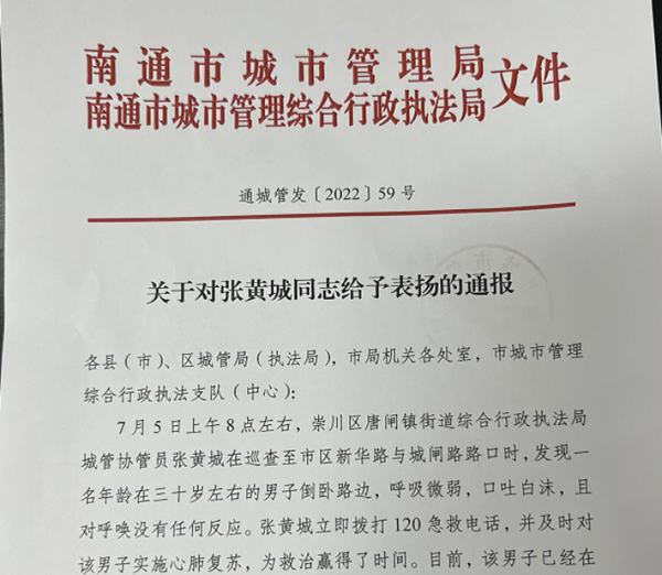 7月6日,南通城管局發(fā)出通報,在全市城管系統對崇川區(qū)唐閘鎮(zhèn)街道綜合行政執(zhí)法局城管協管員張黃城救治他人的行為給予表揚,并號召全系統向張黃城學習。