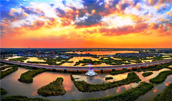 除了路和賞心悅目的綠化景觀,行走在千垛美路上,美輪美奐的雕塑小品不斷躍入眼簾,展示著水鄉(xiāng)特色,講述著興化故事。烏巾蕩大橋上威武雄壯的岳飛雕像,以及不遠(yuǎn)處的“得勝”號宋代古戰(zhàn)船,講述著烏巾蕩的歷史傳說,展示了國家級非遺項(xiàng)目竹泓木船制作技藝;由多只展翅飛翔的白鷺組成的“白鷺迎賓”雕塑栩栩如生,表現(xiàn)了水鄉(xiāng)人民與鳥類和諧共生、生態(tài)優(yōu)越的美麗場景。