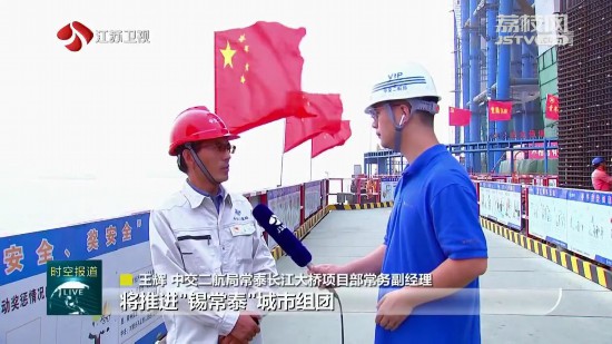 江蘇臺記者 薛蘇陽:我現(xiàn)在所在的位置是常泰長江大橋泰興側(cè)5號墩索塔施工點。今天是國慶節(jié)。走進(jìn)施工現(xiàn)場,我最大的感受就是“紅”。不僅有紅旗的迎風(fēng)飄揚(yáng),更有大橋建設(shè)者工作的紅紅火火。