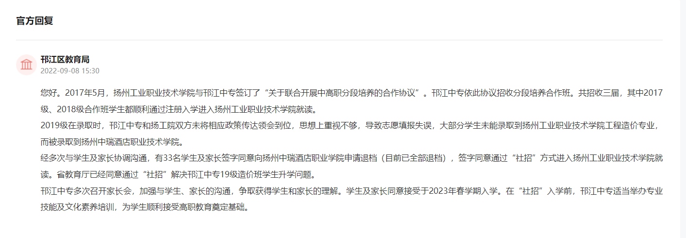 留言交辦后,當(dāng)?shù)亟逃块T和邗江中專高度重視,多次協(xié)調(diào)溝通。邗江區(qū)教育局表示,江蘇省教育廳已經(jīng)同意通過“社招”解決邗江中專2019級造價班學(xué)生升學(xué)問題,33名學(xué)生及其家長同意2023年春學(xué)期入學(xué)揚(yáng)工院。在“社招”入學(xué)前,邗江中專適當(dāng)舉辦專業(yè)技能及文化素養(yǎng)培訓(xùn),為學(xué)生順利接受高職教育奠定基礎(chǔ)。