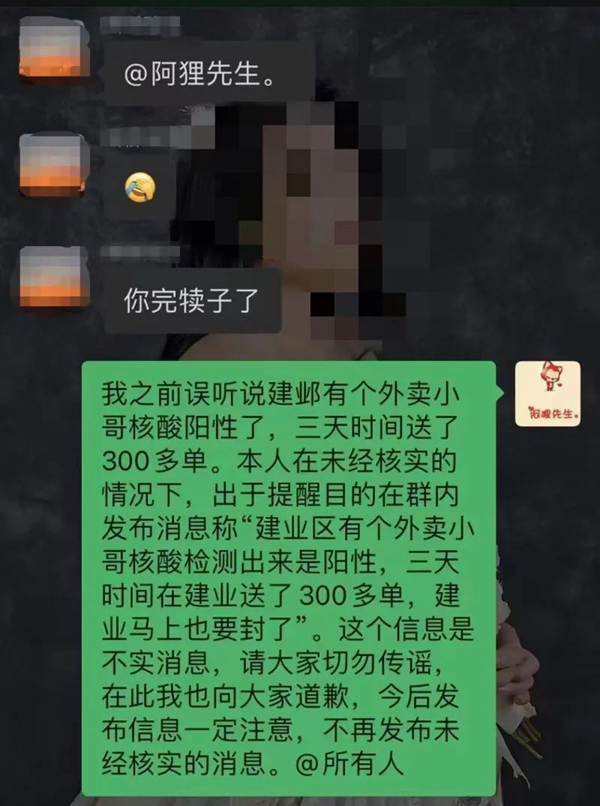 人民網(wǎng)南京11月4日電 據(jù)南京市互聯(lián)網(wǎng)信息辦公室辟謠專用賬號“南京網(wǎng)絡(luò)辟謠”消息,11月3日,微信群流傳一則消息,內(nèi)容提到“建鄴區(qū)有外賣小哥核酸陽性,三天跑了300多單,建鄴馬上要大爆發(fā)”。相關(guān)消息引起很多網(wǎng)民的關(guān)注和擔(dān)憂。