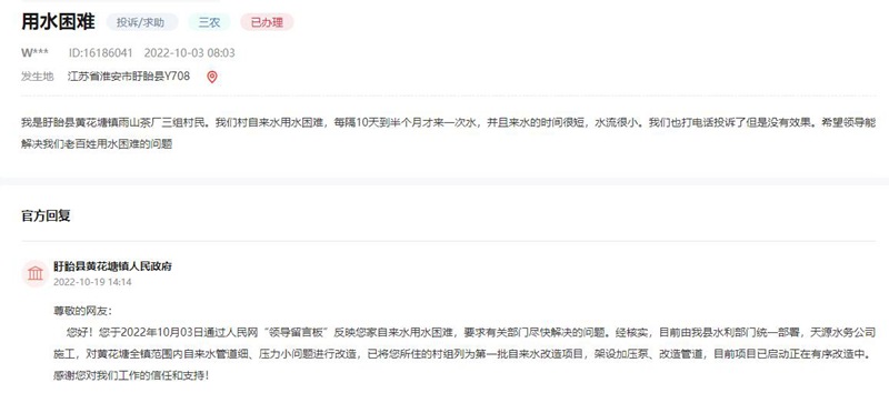 “那里地處丘陵地帶,地勢相對(duì)較高,加上管道較細(xì)、壓力較小,導(dǎo)致經(jīng)常停水?!?1月1日,黃花塘鎮(zhèn)政府工作人員向人民網(wǎng)確認(rèn),全鎮(zhèn)自來水管道改造項(xiàng)目已經(jīng)啟動(dòng),本月就能前往留言人所屬的村組架設(shè)加壓泵、改造管道。