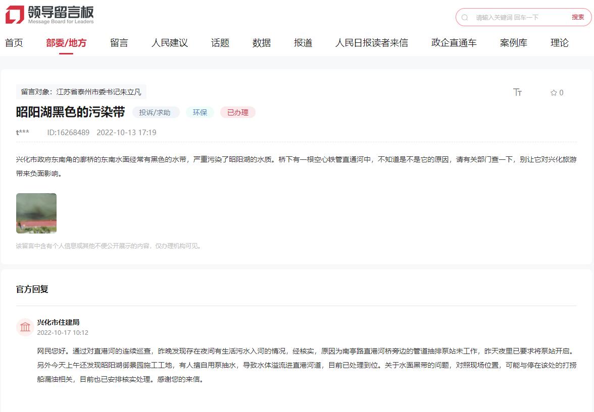 10月13日,泰州興化市民張女士關(guān)注到直港河城區(qū)水面出現(xiàn)了黑色水帶,擔(dān)心會影響昭陽湖水質(zhì)。在人民網(wǎng)“領(lǐng)導(dǎo)留言板”反映后,興化市住建局經(jīng)連續(xù)巡查,發(fā)現(xiàn)存在夜間有生活污水入河的情況,原因?yàn)槟贤ぢ分备酆訕蚺赃叺墓艿莱榕疟谜疚垂ぷ?,已要求將泵站開啟。此外還發(fā)現(xiàn)有人在昭陽湖御景園施工工地擅自用泵抽水,導(dǎo)致水體溢流進(jìn)直港河道,已處理到位。針對水面黑帶的問題,對照現(xiàn)場位置,可能與停在該處的打撈船漏油相關(guān),也已安排核實(shí)處理。
