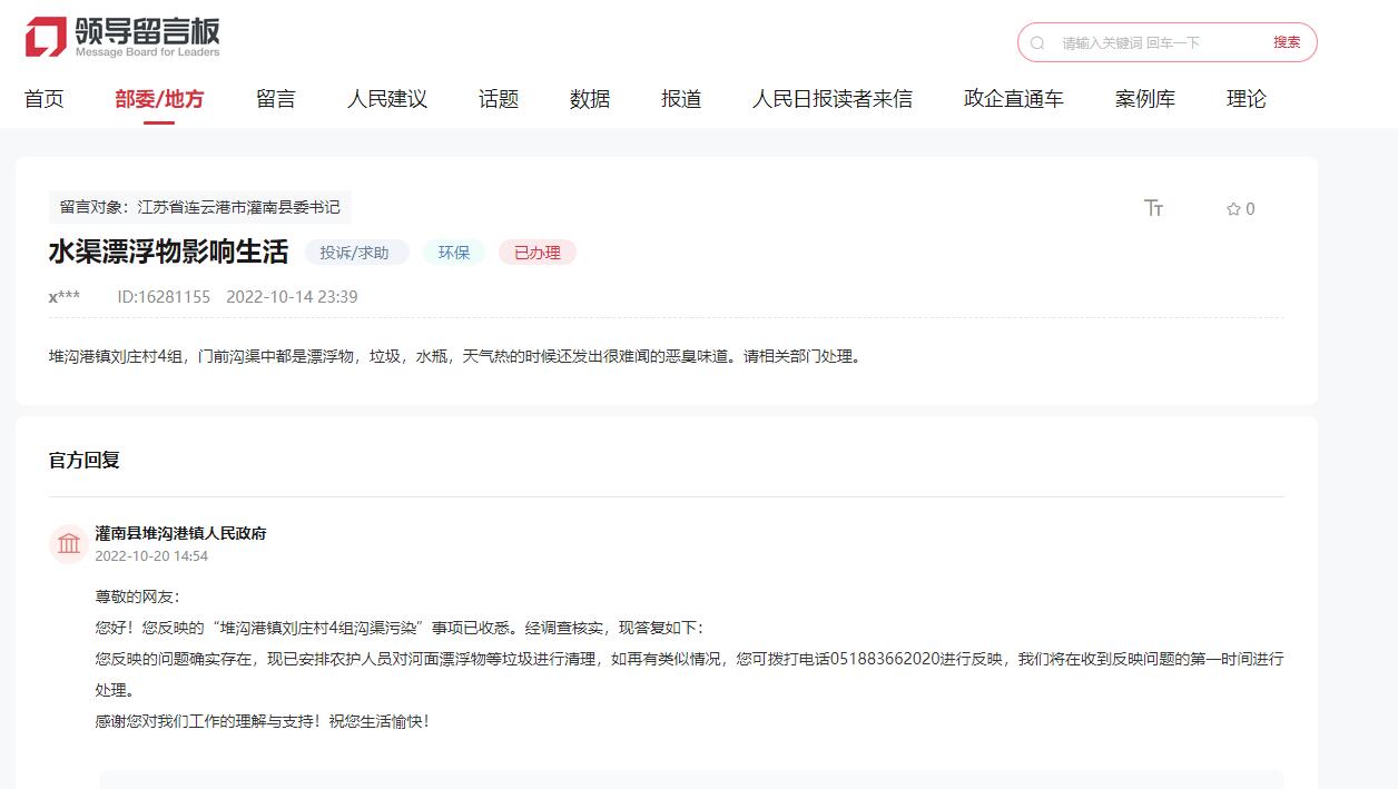“門前溝渠中都是漂浮物,有垃圾、水瓶等?!边B云港灌南縣堆溝港鎮(zhèn)劉莊村的席先生留言后也很快得到跟進(jìn)處理。他在問題解決后跟評說,“我在家看到政府工作人員來我們劉莊溝渠清理和打撈瓶子、塑料袋這些生活垃圾了,現(xiàn)在河里很干凈,跟之前大不相同,而且中午的時(shí)候也沒什么臭味了。政府那么快地處理這件事,我真的特別滿意?!?/p>