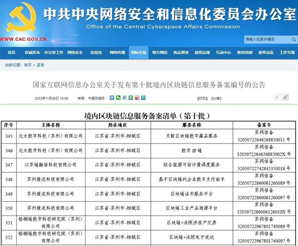 國家網(wǎng)信辦發(fā)布第十批區(qū)塊鏈項目備案號 蘇州高鐵新城上榜8個