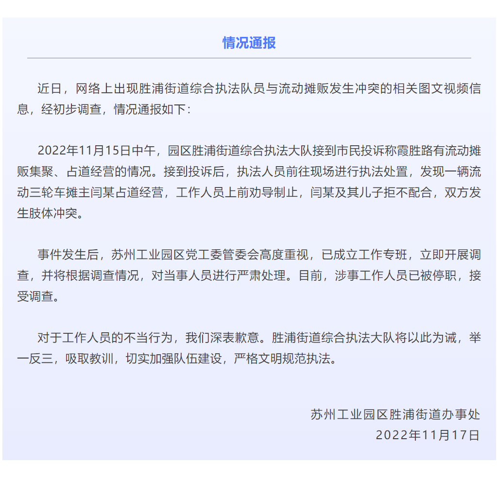 人民網(wǎng)南京11月17日電 近日,有網(wǎng)友爆料稱蘇州工業(yè)園區(qū)一商販和城管發(fā)生沖突,被多名城管按倒在地毆打并踹頭。11月17日,蘇州工業(yè)園區(qū)勝浦街道辦事處對(duì)此發(fā)布情況通報(bào)。通報(bào)中稱,蘇州工業(yè)園區(qū)黨工委管委會(huì)已成立工作專班,立即開展調(diào)查,并將根據(jù)調(diào)查情況,對(duì)當(dāng)事人員進(jìn)行嚴(yán)肅處理。目前,涉事工作人員已被停職,接受調(diào)查。