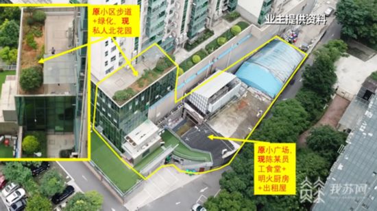 “這張圖對應(yīng)的就是現(xiàn)在這個位置,原來這是綠化道路,一直到圍墻。現(xiàn)在這個玻璃幕墻把它堵死了,里面住人,房子一間一間,裝修好好的?!睒I(yè)主張女士說。