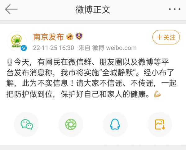 人民網(wǎng)南京11月25日電 25日,有網(wǎng)民在微信群、朋友圈以及微博等平臺(tái)發(fā)布消息稱,南京市將實(shí)施“全城靜默”,引發(fā)社會(huì)廣泛關(guān)注。當(dāng)天下午,南京發(fā)布在官方微博回應(yīng),此為不實(shí)信息。