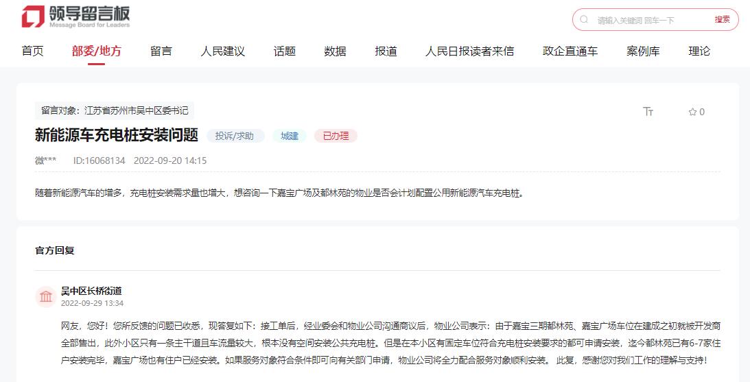 “嘉寶廣場(chǎng)與都林苑的物業(yè)是否有計(jì)劃配置新能源汽車公共充電樁?”9月20日,馬女士在人民網(wǎng)“領(lǐng)導(dǎo)留言板”留言。不久,吳中區(qū)長橋街道回復(fù),由于兩個(gè)小區(qū)的車位在建成之初就被開發(fā)商全部售出,且小區(qū)只有一條主干道,車流量較大,沒有空間安裝公共充電樁。但業(yè)主如果有固定車位且符合安裝要求,都可申請(qǐng)安裝,兩個(gè)小區(qū)均有住戶已安裝充電樁?!稗k理速度快,很滿意?!瘪R女士9月30日再次留言說。