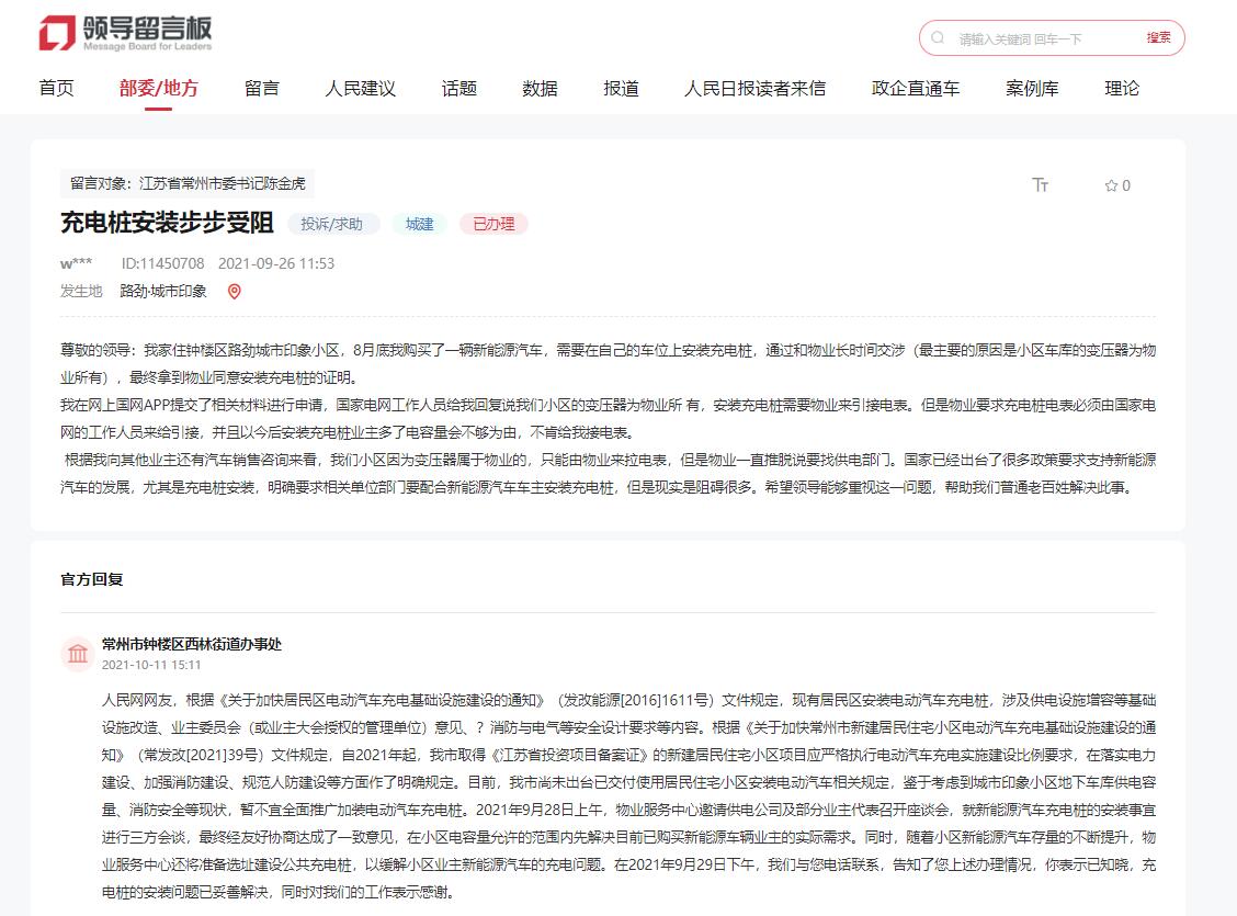 隨著新能源汽車用戶增多,對(duì)充電樁的需求也逐漸增加。今年9月20日,蘇州吳中區(qū)居民馬女士在人民網(wǎng)“領(lǐng)導(dǎo)留言板”咨詢新能源汽車充電樁問題。隨后,她得到答復(fù)可以申請(qǐng)安裝。去年以來,江蘇尤其是蘇南地區(qū)居民此類留言較多,目前大多已得到積極回應(yīng)與解決。