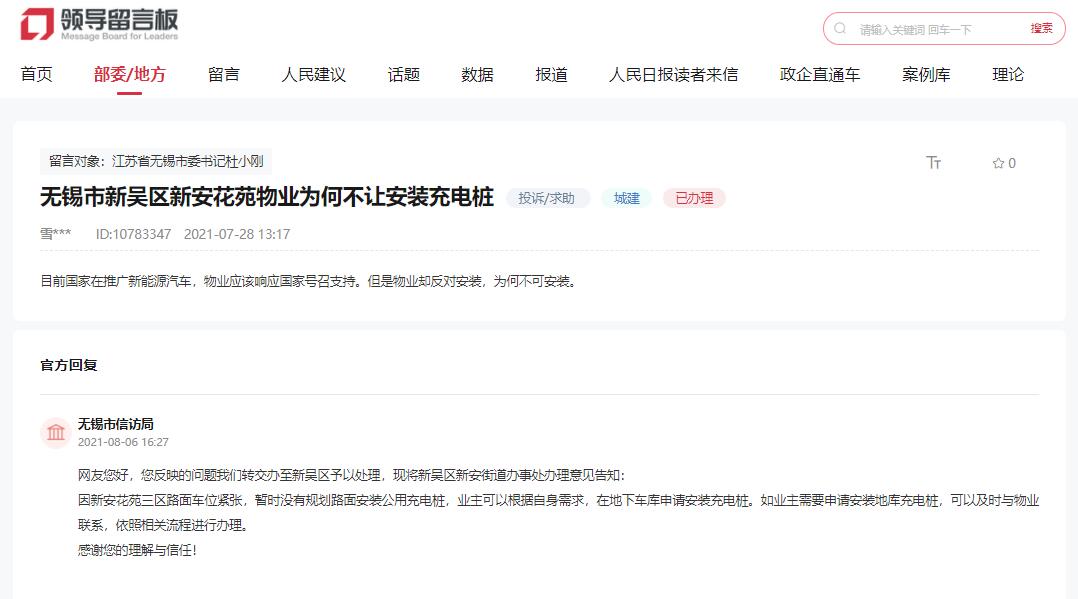 2021年7月28日,無錫新吳區(qū)居民樊先生留言反映,他們小區(qū)物業(yè)不同意安裝充電樁。留言后,新吳區(qū)新安街道回復(fù),由于小區(qū)內(nèi)路面車位緊張,暫時(shí)沒有規(guī)劃路面安裝公共充電樁,業(yè)主如果需要申請(qǐng)安裝地庫充電樁,可以依照相關(guān)流程進(jìn)行辦理。樊先生告訴人民網(wǎng),經(jīng)過協(xié)調(diào),他已經(jīng)安裝好了充電樁,現(xiàn)在開車回家隨時(shí)可以充電,方便多了。