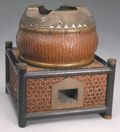 此次展覽中展出了一件原藏于紫禁城重華宮內(nèi)的竹茶爐。此爐分為上下兩部分,上圓下方,上為炭爐,內(nèi)以泥作壁,外包竹絲編織;下為方形火灶,開長方形風口,邊框以竹作架,并以寬細竹絲編織六角篾紋包裹。銚座為銅制并鑄有紋飾,圓、方爐上下皆有紅銅護圈,做工精巧細致。