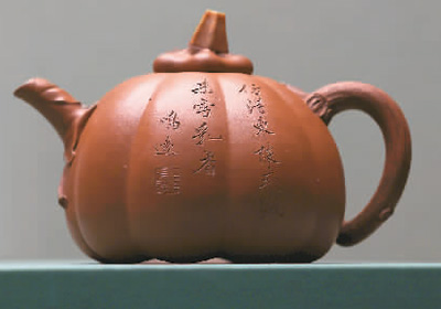 此次展覽中的東陵南瓜壺是無錫宜興紫砂壺珍品,由素有“花器圣手”之稱的清代名匠陳鳴遠制作,現(xiàn)藏于南京博物院。此壺以瓜為壺體,瓜蒂為壺蓋,瓜蔓為壺把,瓜葉盤旋成壺嘴,造型生動自然,獨具匠心。壺身題詞“仿得東陵式 盛來雪乳香 鳴遠”,并壓鈴陽文篆體“陳鳴遠”方印。
