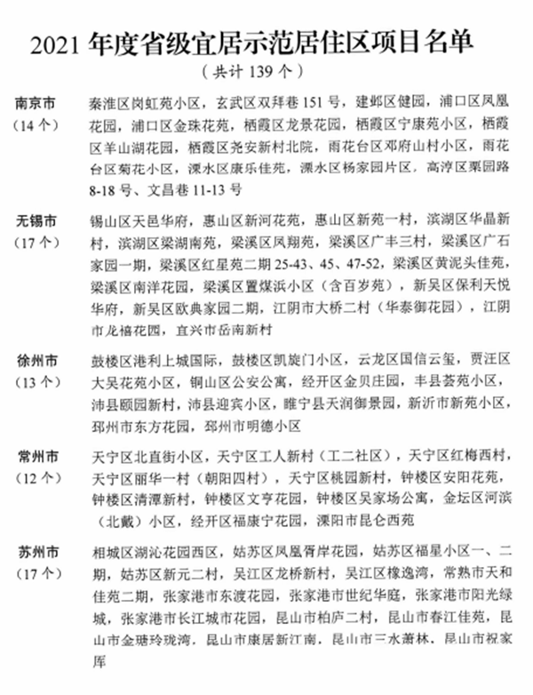 人民網(wǎng)南京12月10日電 據(jù)江蘇省住建廳消息,日前,2021年度省級(jí)宜居示范居住區(qū)項(xiàng)目名單公布,南京市秦淮區(qū)崗虹苑小區(qū)、無錫市惠山區(qū)新河花苑等139個(gè)項(xiàng)目入選,達(dá)到省級(jí)宜居示范居住區(qū)標(biāo)準(zhǔn)。