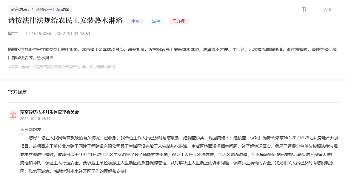 留言后,南京經(jīng)開區(qū)管委會已督促總包單位按照法律法規(guī)要求立即進行整改,項目部已對生活區(qū)男女浴室加裝了速熱式熱水器,保證工人冬天沖洗方便;生活區(qū)地面濕滑、污水橫流等問題已安排后勤保潔人員每天進行清理和沖洗,保證工人行走安全。并要求施工單位加強工人生活區(qū)的后勤保障管理,及時解決工人生活上的訴求問題,保障民工宿舍的安全。