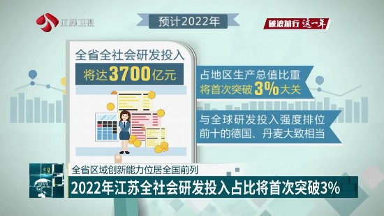 夯實創(chuàng)新基石,江蘇戰(zhàn)略科技力量培育碩果累累:蘇州實驗室獲批建設(shè),紫金山實驗室納入國家戰(zhàn)略科技力量體系,生物育種鐘山實驗室掛牌運行……一批承擔(dān)國家使命、體現(xiàn)江蘇擔(dān)當(dāng)?shù)膽?zhàn)略科技力量在江蘇的創(chuàng)新“高原”上崛起為更多“高峰”。預(yù)計2022年全省全社會研發(fā)投入將達(dá)3700億元,占地區(qū)生產(chǎn)總值比重將首次突破3%大關(guān),與全球研發(fā)投入強度排位前十的德國、丹麥大致相當(dāng);萬人發(fā)明專利擁有量超過49件,是全國平均水平的2倍,保持全國省份第一;全省科技進步貢獻率達(dá)67%左右,區(qū)域創(chuàng)新能力繼續(xù)位居全國前列。