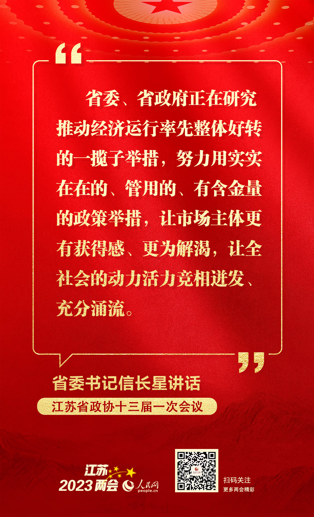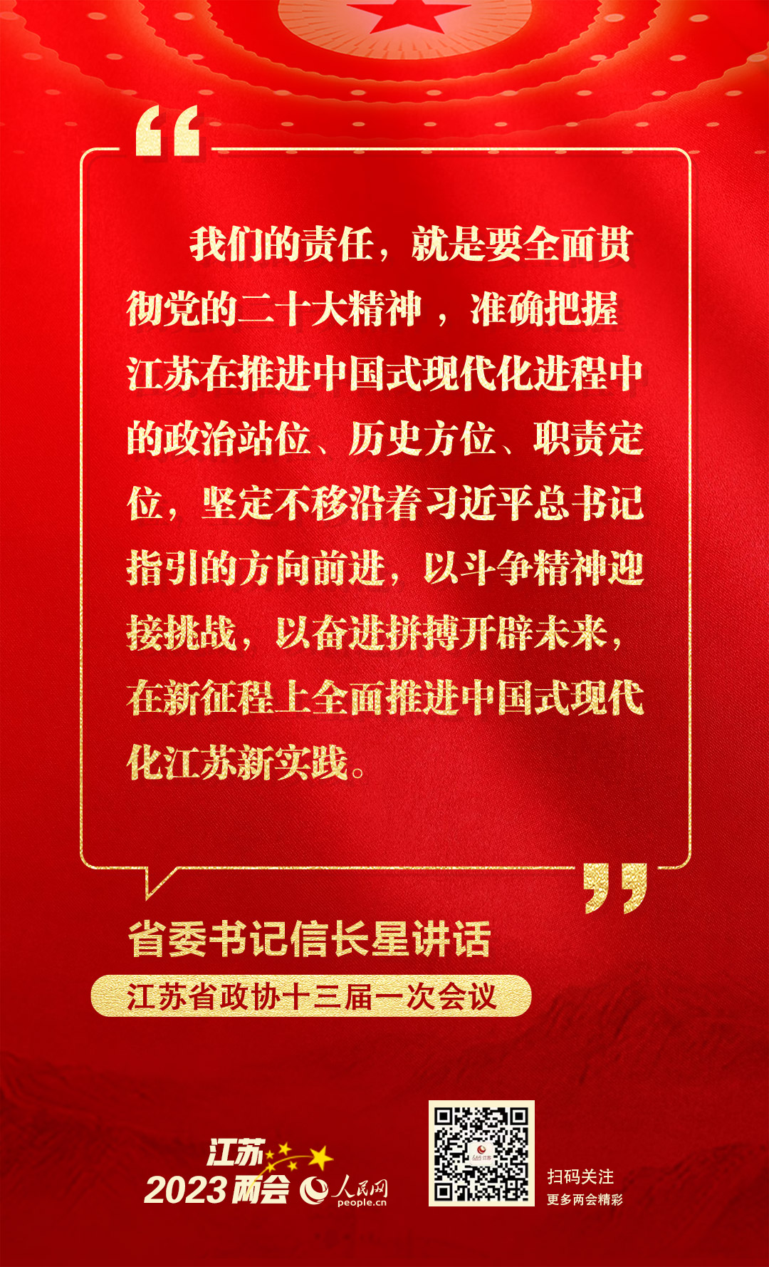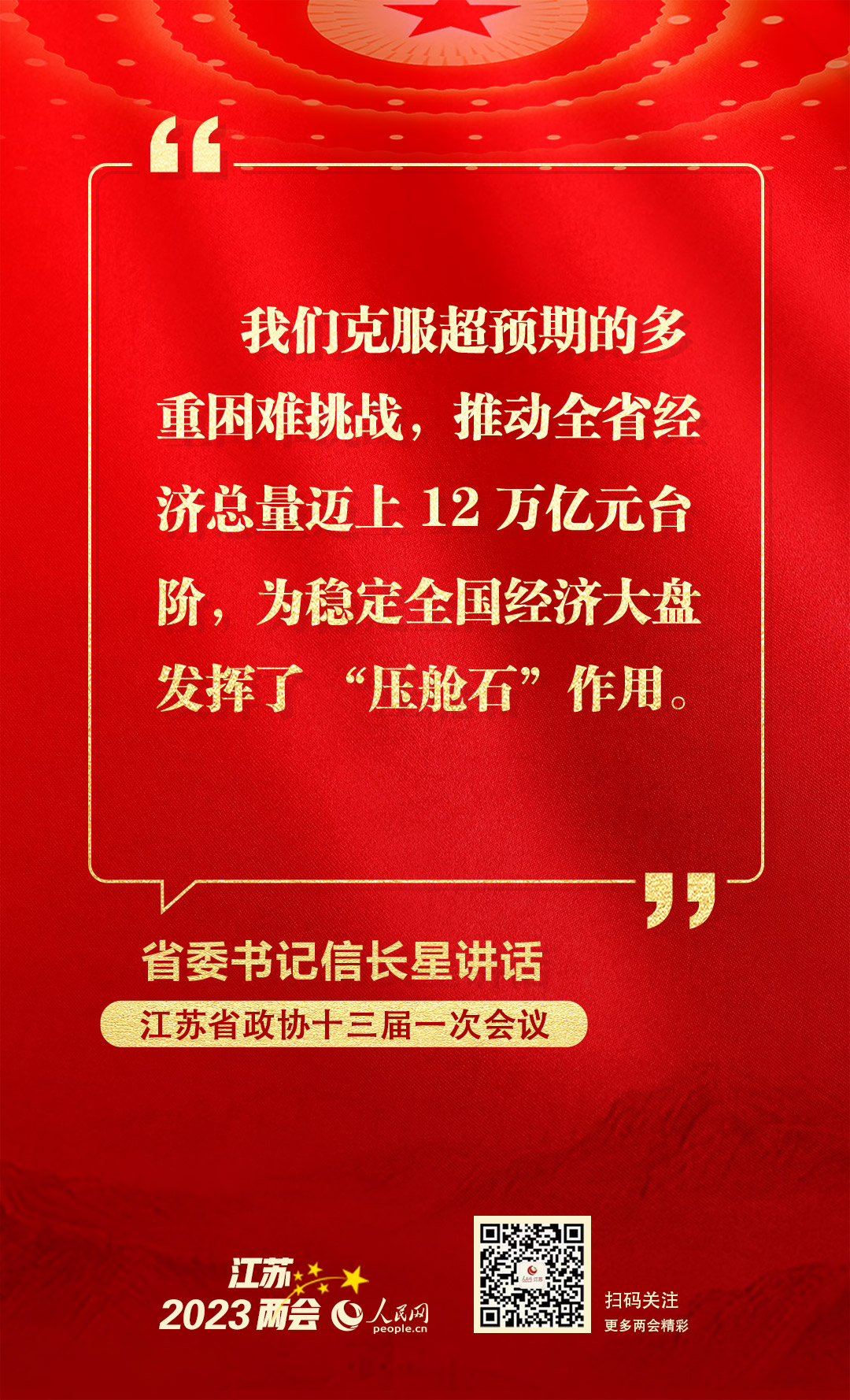 1月14日,江蘇省政協(xié)十三屆一次會議在南京開幕?;仡?022年,江蘇省委書記信長星在講話中說:這一年,全省上下以迎接二十大、學習宣傳貫徹二十大精神為主線,全面落實黨中央“疫情要防住、經濟要穩(wěn)住、發(fā)展要安全”重大要求,切實擔起經濟大省“勇挑大梁”重大責任,在全面建設社會主義現(xiàn)代化新征程上邁出堅實步伐。以下是我們從講話中提取的十句務實精干、催人奮進的話語。