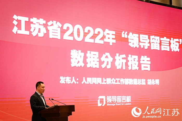 人民網(wǎng)網(wǎng)上群眾工作部數(shù)據(jù)總監(jiān)胡永明發(fā)布《江蘇省2022年“領(lǐng)導(dǎo)留言板”數(shù)據(jù)分析報告》。人民網(wǎng) 馬燾燾攝