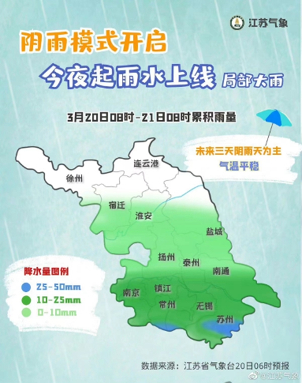 上周天氣舞臺真是變化多端,江蘇下了春雪。新的一周,江蘇將持續(xù)一周下春雨。氣象資料顯示,從今天開始江蘇氣溫迅速回升,不過20日—25日全省春雨連綿,一改前期少雨格局,進入多雨期。尤其是20日夜里到21日,沿江和蘇南地區(qū)雨量中等局部有大雨,出行要注意交通安全。