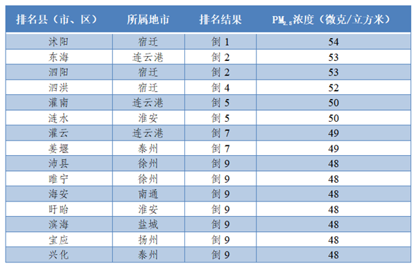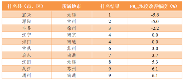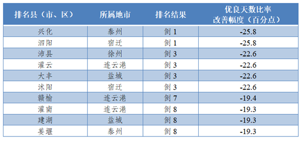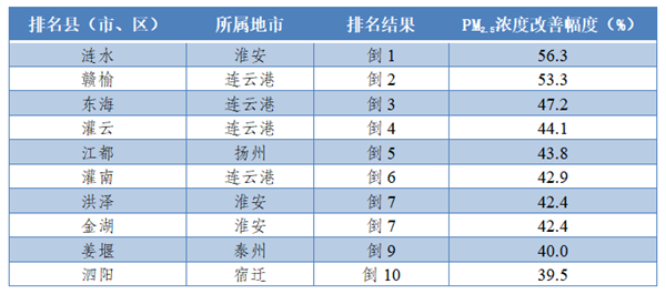 從PM2.5濃度改善幅度看,相對較好的前10位(1-10名)依次是:宜興、溧陽、豐縣、江寧(海門并列)、常熟、啟東、江陰、吳江(通州并列);相對較差的后10位(倒1-10名)依次是:漣水、贛榆、東海、灌云、江都、灌南、洪澤(金湖并列)、姜堰、泗陽。
