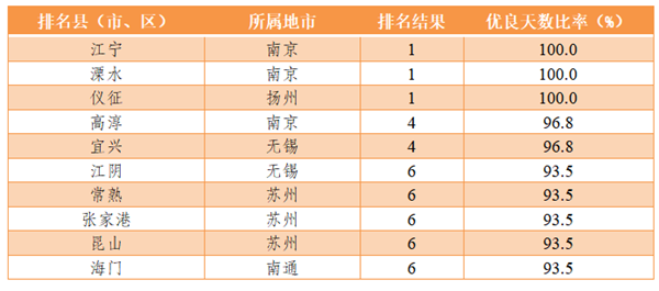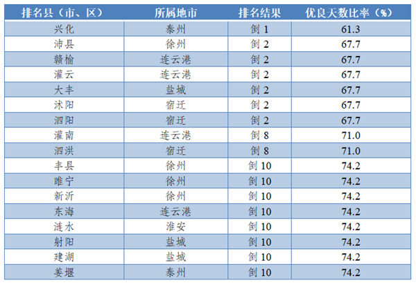 從優(yōu)良天數(shù)比率看,相對較好的前10位(1-10名)依次是:江寧(溧水、儀征并列)、高淳(宜興并列)、江陰(常熟、張家港、昆山、海門并列);相對較差的后10位(倒1-10名)依次是:興化、沛縣(贛榆、灌云、大豐、沭陽、泗陽并列)、灌南(泗洪并列)、豐縣(睢寧、新沂、東海、漣水、射陽、建湖、姜堰并列)。