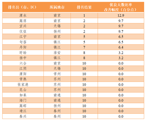 從優(yōu)良天數(shù)比率改善幅度看,相對較好的前10位(1-10名)依次是:溧水、高淳(宜興、儀征并列)、江寧(句容并列)、丹陽、盱眙(揚(yáng)中并列)、六合(江陰、溧陽、常熟、張家港、昆山、如皋、海門、高郵、靖江、泰興并列);相對較差的后10位(倒1-10名)依次是:興化(泗陽并列)、沛縣(灌云、大豐、沭陽并列)、贛榆、灌南(建湖、姜堰并列)。