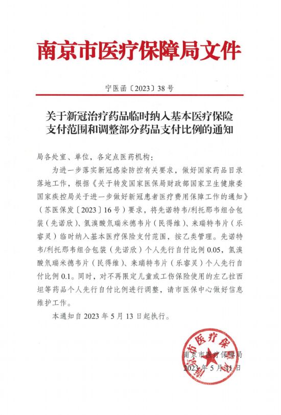 南京市醫(yī)保局關(guān)于新冠藥品的文件,3CL靶點(diǎn)“新冠特效藥”先諾欣個人先行自付比例5%