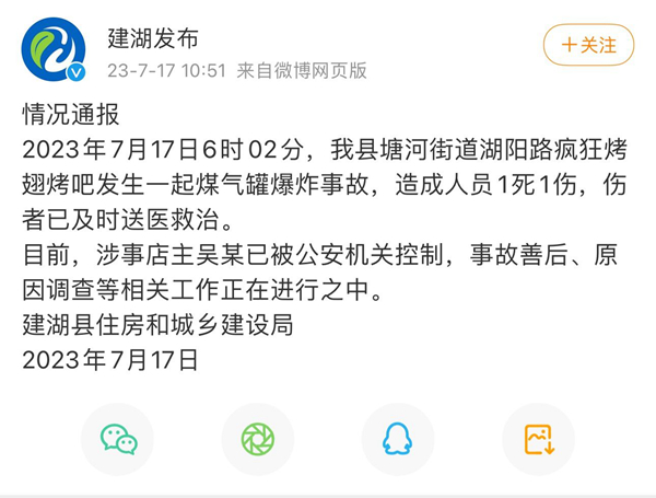 江蘇鹽城建湖一燒烤店發(fā)生煤氣罐爆炸事故 致1死1傷