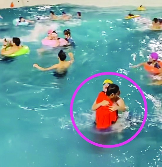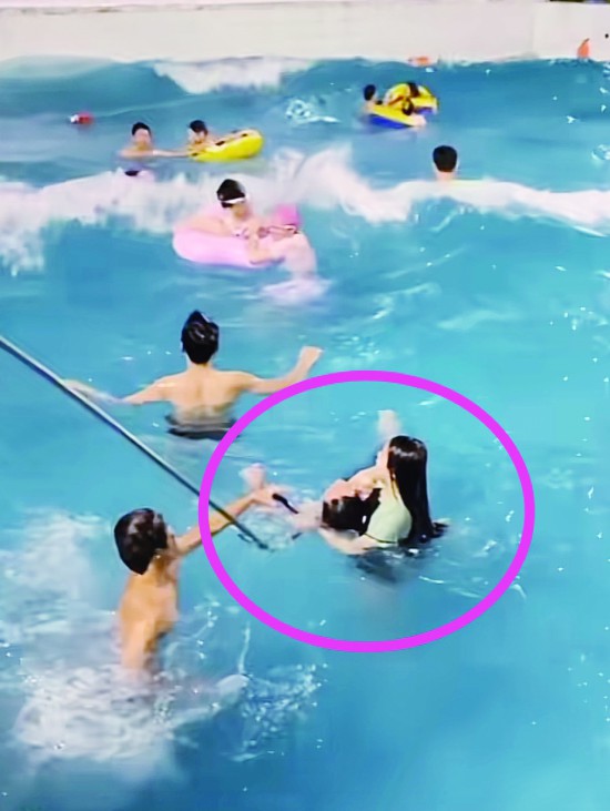 隨后,記者從某社交平臺找到了原視頻。視頻中,一群人在水深1.3米處玩耍,在浪的作用下,一些人無法站穩(wěn)和保持平衡。其中一位女性,緊緊抓住岸邊救援人員的救援棍,移到了岸邊。另一邊,一個戴著黃色泳帽和藍色泳鏡的小男孩被浪沖得與大人分開,喊出“救我,救命”,僅僅三五秒的時間,救生員已跳入泳池,并把小男孩抱上岸,整個救援過程在15秒以內(nèi)。這些片段,就是被網(wǎng)友轉(zhuǎn)發(fā)和熱議的部分。