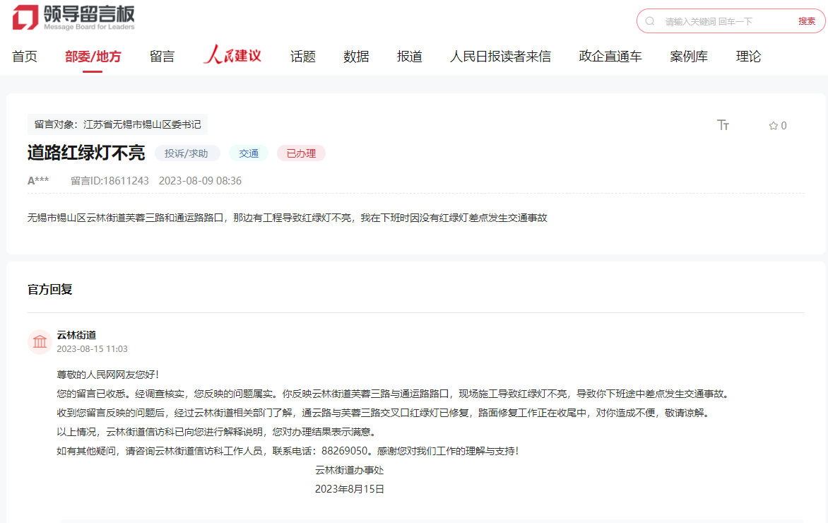 8月9日,無(wú)錫市錫山區(qū)的陳先生留言反映,云林街道芙蓉三路和通云路路口處有工程施工,造成紅綠燈不亮,“我在下班時(shí)因這里沒(méi)有紅綠燈差點(diǎn)發(fā)生交通事故”。15日,云林街道辦事處回復(fù)稱(chēng),通云路與芙蓉三路交叉口紅綠燈已修復(fù),路面修復(fù)工作正在收尾。