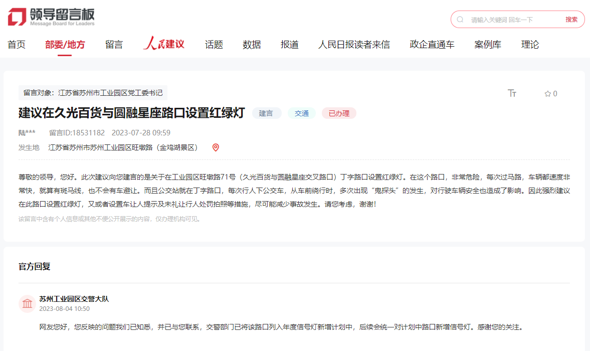 “旺墩路71號(hào)丁字路口,車(chē)速都比較快。此路口還有一個(gè)公交站,行人下公交車(chē),從車(chē)前繞行時(shí)容易出現(xiàn)‘鬼探頭’的情況?!碧K州市民劉女士近日留言,建議在上述路口設(shè)置紅綠燈,盡可能減少事故發(fā)生。“交警部門(mén)已將該路口列入年度信號(hào)燈新增計(jì)劃中,后續(xù)會(huì)統(tǒng)一新增信號(hào)燈。”8月4日,蘇州工業(yè)園區(qū)交警大隊(duì)回復(fù)道。