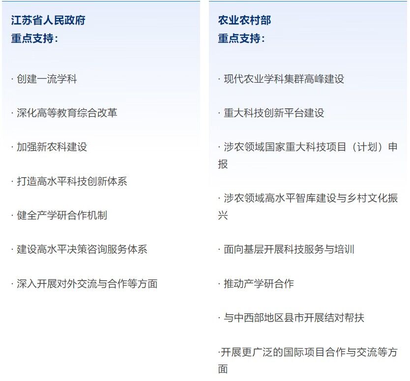 按照共建協(xié)議,江蘇省人民政府和農(nóng)業(yè)農(nóng)村部將在不同維度,給予揚州大學(xué)支持:
