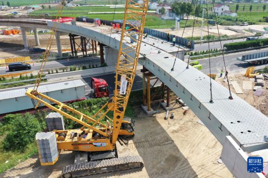 9月8日在江蘇省東臺市拍攝的東興高速上跨G15沈海高速架梁作業(yè)現(xiàn)場(無人機照片)。