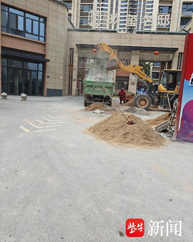 工程車輛橫在小區(qū)門口裝載建筑材料