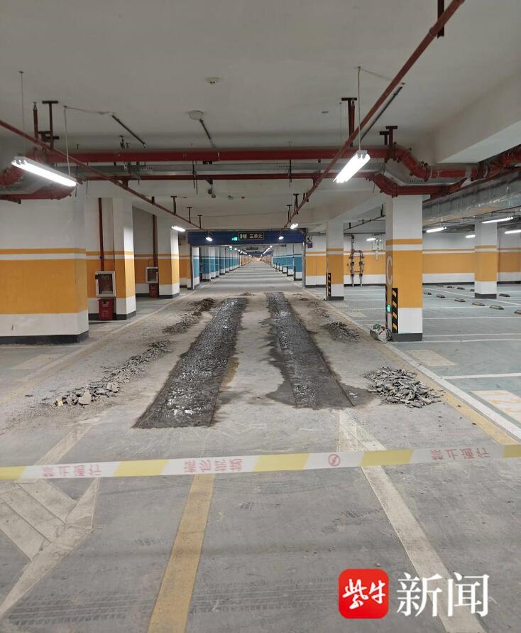 碧桂園玖璽小區(qū)實(shí)施人車分流,車子從小區(qū)外地下車庫入口進(jìn)入,業(yè)主平時可乘坐樓內(nèi)電梯直達(dá)地下車庫。在地下車庫記者看到,碩大的車庫十分空曠,目前沒有幾輛車輛停放,幾隊施工人員在車庫內(nèi)進(jìn)行作業(yè)?!拔覀儸F(xiàn)在主要把車位不平的地方磨平,對凹陷的地方進(jìn)行填補(bǔ)?!庇惺┕と藛T手持打磨機(jī)對地面進(jìn)行著處理,還有人員將問題路面鑿開重新鋪筑。