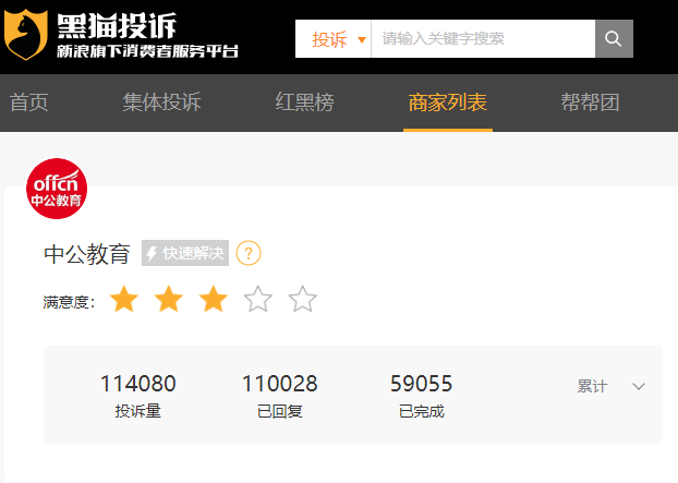 中公教育的退費(fèi)風(fēng)波不僅在江蘇。消費(fèi)者維權(quán)平臺(tái)“黑貓投訴”上,中公教育的累計(jì)投訴量高達(dá)10余萬條,以索要退費(fèi)者居多。