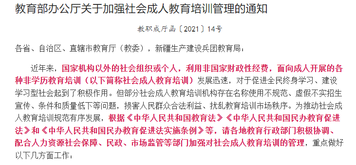 2021年7月,《教育部辦公廳關(guān)于加強(qiáng)社會(huì)成人教育培訓(xùn)管理的通知》要求,根據(jù)有關(guān)法律,請(qǐng)各地教育行政部門積極協(xié)調(diào)、配合人力資源社會(huì)保障、民政、市場監(jiān)管等部門加強(qiáng)對(duì)社會(huì)成人教育培訓(xùn)的管理,其中包括“要完善經(jīng)費(fèi)管理。督促社會(huì)成人教育培訓(xùn)機(jī)構(gòu)依法建立財(cái)務(wù)、會(huì)計(jì)、資產(chǎn)管理和第三方審計(jì)制度,規(guī)范收費(fèi)和退費(fèi)行為。各地教育行政部門要會(huì)同有關(guān)部門健全社會(huì)成人教育培訓(xùn)機(jī)構(gòu)資金監(jiān)管機(jī)制,進(jìn)一步降低預(yù)收資金風(fēng)險(xiǎn)。