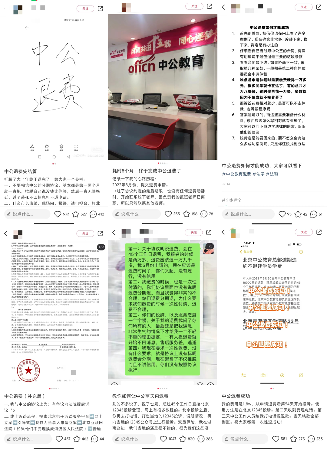 現(xiàn)實(shí)中,等待退費(fèi)的學(xué)員們也在抱團(tuán)“自救”。社交媒體上,不少網(wǎng)友討論中公教育退費(fèi)經(jīng)驗(yàn)。他們分享了包括撥打12315、12345,求助教育部門、市場監(jiān)管部門、信訪部門,進(jìn)行網(wǎng)絡(luò)投訴,提起訴訟、仲裁等各種解決問題的渠道。有網(wǎng)友表示,自己根據(jù)網(wǎng)上的“攻略”,打出索賠“組合拳”,雖大費(fèi)周章,但最終成功把錢要了回來。