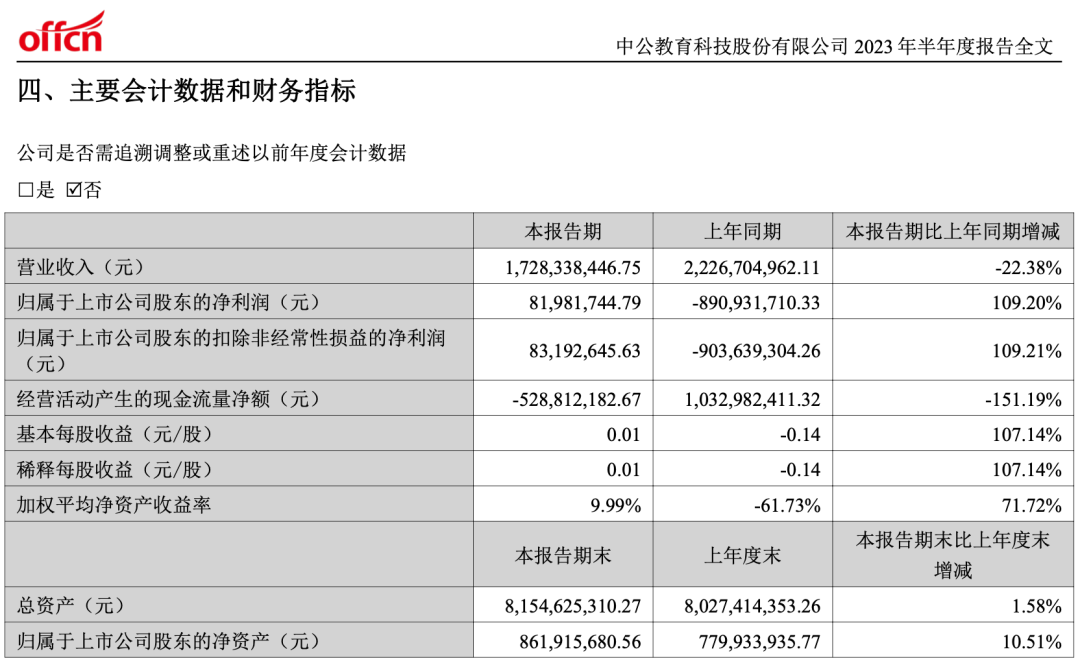 危機(jī)當(dāng)前,中公教育加緊調(diào)整。該公司8月30日發(fā)布的半年報(bào)稱,公司運(yùn)營逐步向正常軌道回歸,并在上半年實(shí)現(xiàn)了良好的利潤增長。半年報(bào)顯示,報(bào)告期內(nèi)公司實(shí)現(xiàn)營業(yè)總收入17.28億元,實(shí)現(xiàn)歸屬于上市公司股東的凈利潤8198.17萬元,比上年同期增長109.20%。