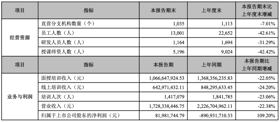 但實(shí)際上,其報(bào)告期內(nèi)主營收入同比下降了22.38%,利潤增長與其“優(yōu)化人員結(jié)構(gòu)”有不小關(guān)系。據(jù)了解,中公教育近半年削減了78個(gè)直營分支機(jī)構(gòu),縮減員工近萬名,其中授課教師減少3800多名,較上年度末減少42.42%。