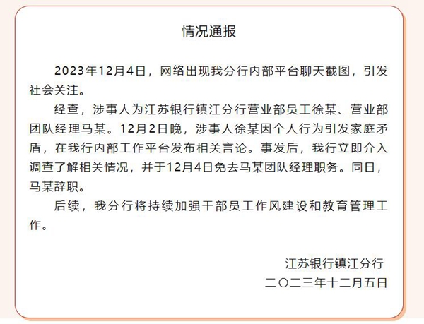 通報顯示,12月2日晚,涉事人徐某因個人行為引發(fā)家庭矛盾,在江蘇銀行鎮(zhèn)江分行內部工作平臺發(fā)布相關言論。事發(fā)后,江蘇銀行鎮(zhèn)江分行立即介入調查了解相關情況,并于12月4日免去馬某團隊經理職務。同日馬某辭職。
