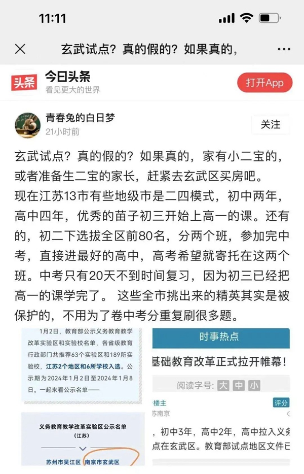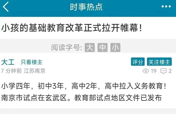 近日,網(wǎng)傳南京玄武和蘇州吳江這兩個(gè)地區(qū)基礎(chǔ)教育將從12年改成9年,其中小學(xué)4年、初中3年、高中2年,相關(guān)消息還登上了地區(qū)論壇、門戶網(wǎng)站。