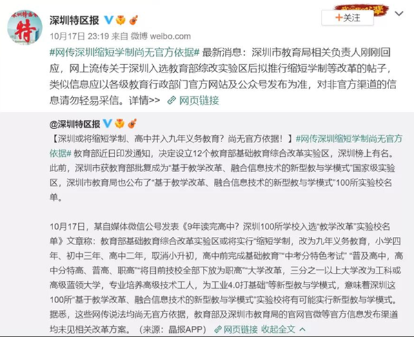 實(shí)際上,實(shí)驗(yàn)區(qū)縮短學(xué)制傳言在前兩年已經(jīng)出現(xiàn),多地教育部門曾進(jìn)行過(guò)澄清。例如,2021年10月17日,深圳市教育局表示,試驗(yàn)區(qū)縮短學(xué)制的教改措施均尚無(wú)官方依據(jù),并提醒廣大家長(zhǎng),類似信息應(yīng)以各級(jí)教育行政部門官方網(wǎng)站及公眾號(hào)發(fā)布為準(zhǔn),勿輕易采信非官方渠道的信息。次日,成都市教育局也通過(guò)媒體表態(tài),實(shí)驗(yàn)區(qū)將縮短學(xué)制的說(shuō)法并非事實(shí)。