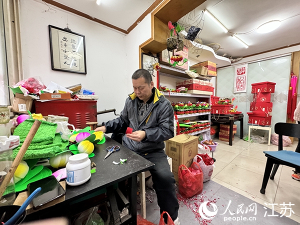 拿出一疊經(jīng)過(guò)“壓模”的紙張悉心裁剪,一片片彩紙逐漸有了龍鱗的模樣……1月31日,南京秦淮燈彩省級(jí)非遺傳承人陸敏正在工作室趕制花燈——除夕前,他有200多個(gè)花燈要完成。