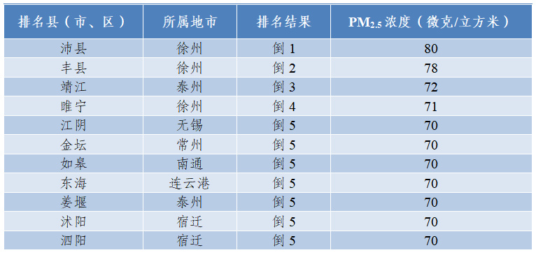 江蘇發(fā)布1月環(huán)境空氣質(zhì)量排名 沛縣豐縣靖江PM2.5濃度相對較差