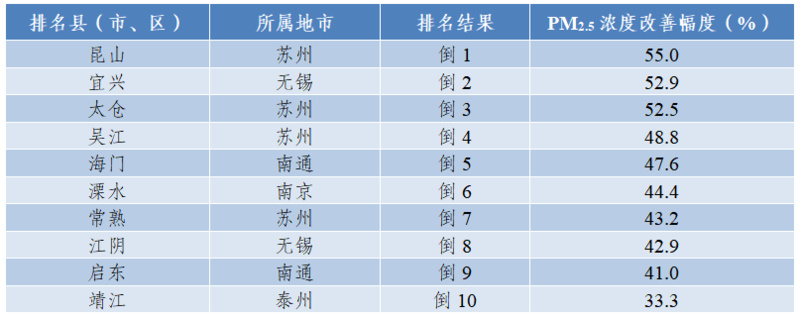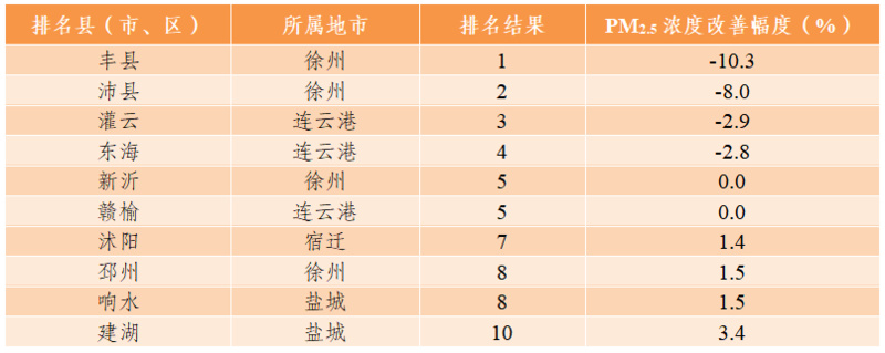 PM2.5濃度改善幅度相對較好的前10位(1—10名)依次是: