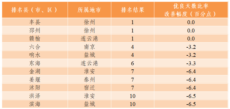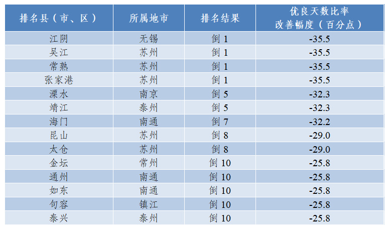 優(yōu)良天數(shù)比率改善幅度相對較差的后10位(倒1—10名)依次是: