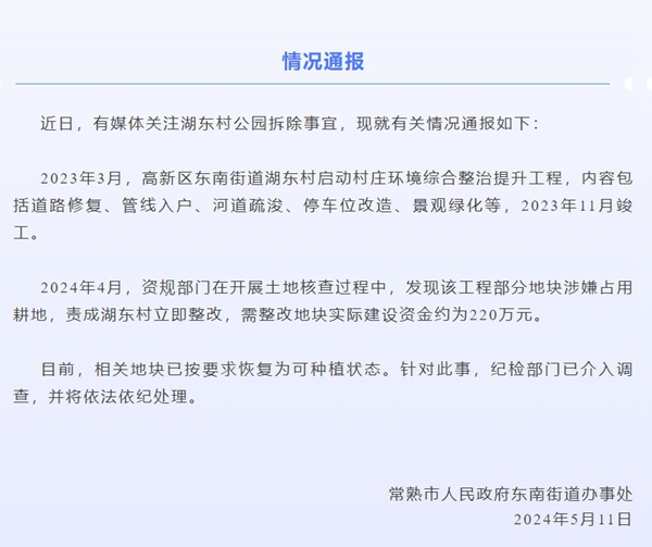 人民網(wǎng)蘇州5月11日電 (徐晨曦)近日,江蘇常熟一座公園建成使用不到5個月就被拆除一事引發(fā)輿論關(guān)注。11日晚,常熟市東南街道辦事處發(fā)布情況通報(bào)稱,該工程部分地塊涉嫌占用耕地,紀(jì)檢部門已介入調(diào)查。
