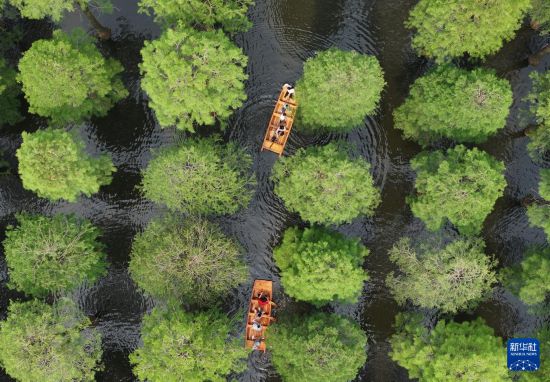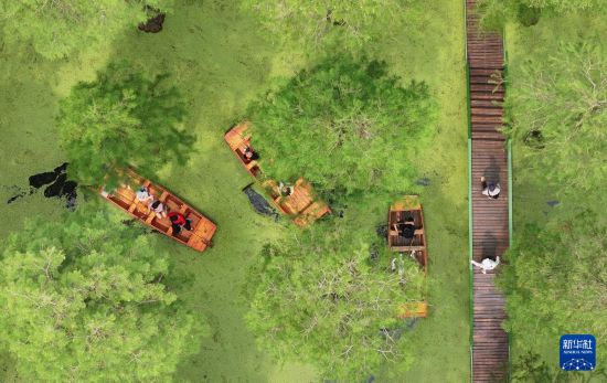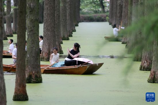 初夏時節(jié),江蘇省揚州市淥洋湖濕地公園內“水上森林”蔥郁清涼,成為游客休閑避暑的好去處。