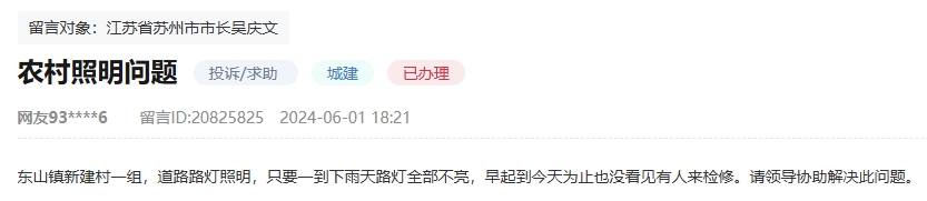 “東山鎮(zhèn)新建村一組,只要一到下雨天,道路路燈就不亮?!?月1日,蘇州吳中區(qū)網(wǎng)友王先生亦留言反映了當(dāng)?shù)芈窡舨涣恋膯栴}。接到留言后,吳中區(qū)渡橋村工作人員與村維修電工及第三方路燈公司赴現(xiàn)場(chǎng)勘查,發(fā)現(xiàn)該村路燈一路總線老化,遇刮風(fēng)下雨自動(dòng)跳閘,導(dǎo)致路燈不亮。目前已對(duì)線路進(jìn)行更換,將前期一路總線更改為三路分線,調(diào)試后路燈恢復(fù)正常工作。